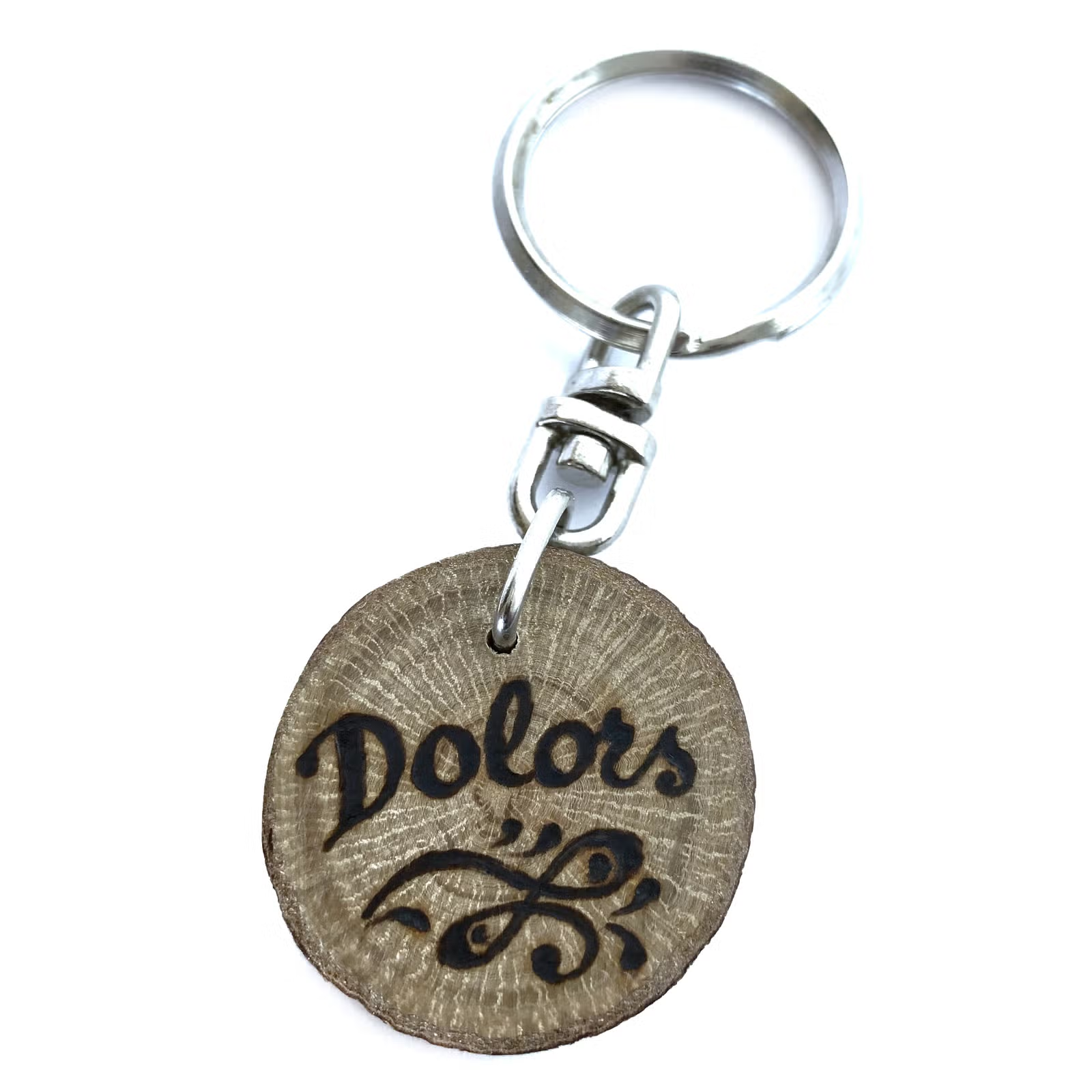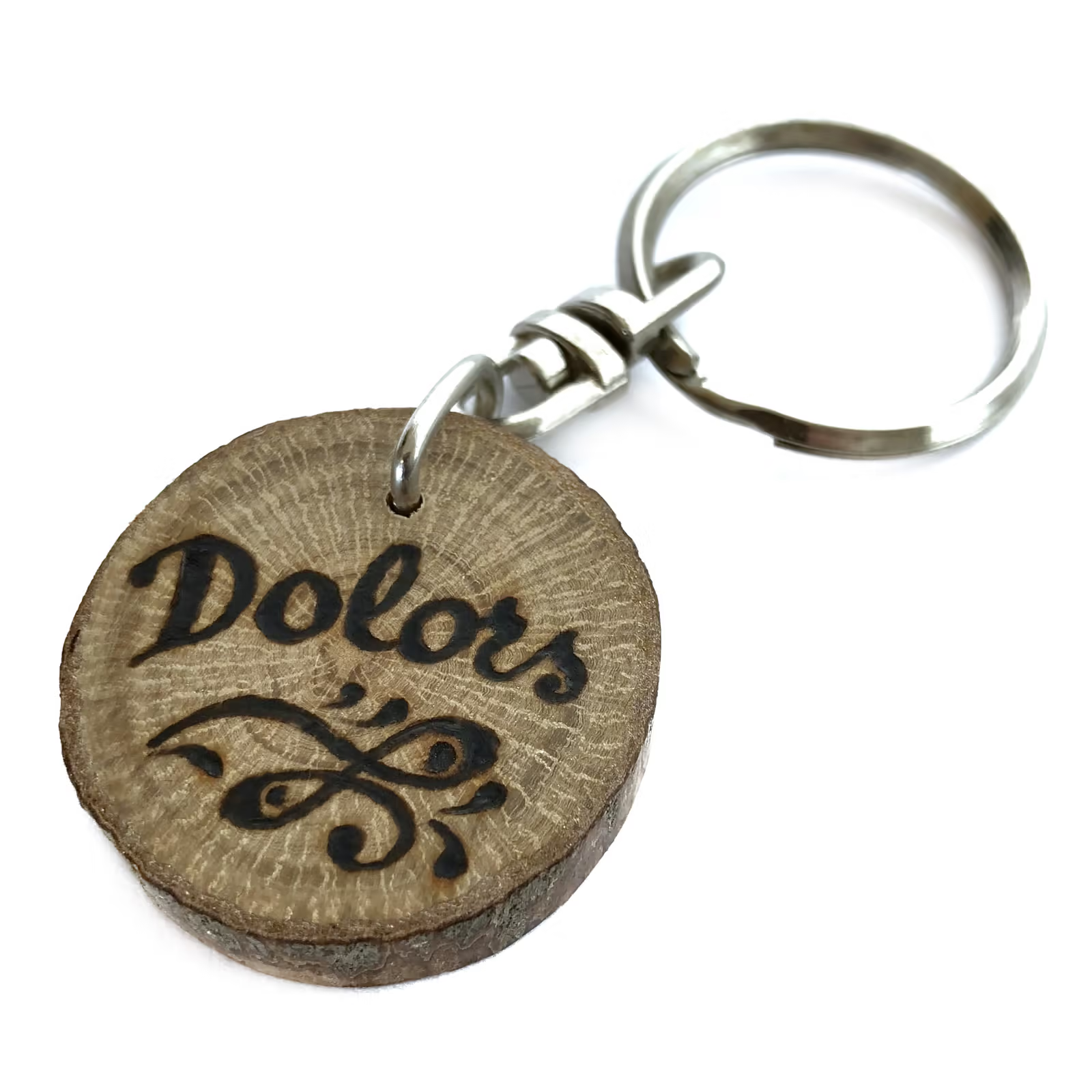 Tingues en compte que el clauer que rebis a casa pot ser lleugerament diferent de les imatges visualitzades ja que tant el nom com el dibuix els pirogravem a mà un a un, amb la qual cosa cada clauer és únic. També la forma i mida de la rodanxa poden variar, perquè a la naturalesa no hi ha 2 branques iguals.