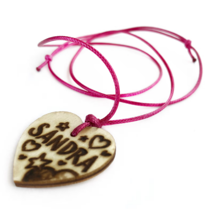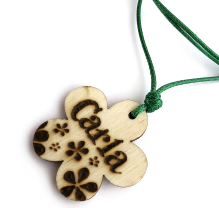 Collaret de fusta d’alzina pirogravat i elaborat de manera totalment artesanal. És molt lleuger i agradable al tacte, ja que l’acabat és en fusta natural. Perquè toquis fusta en qualsevol moment!