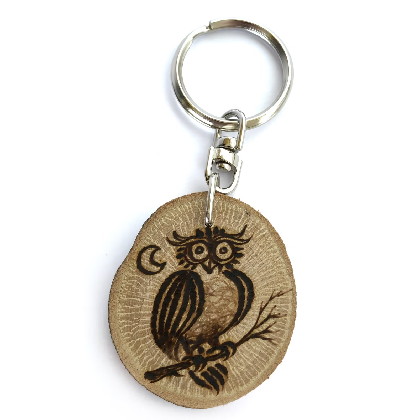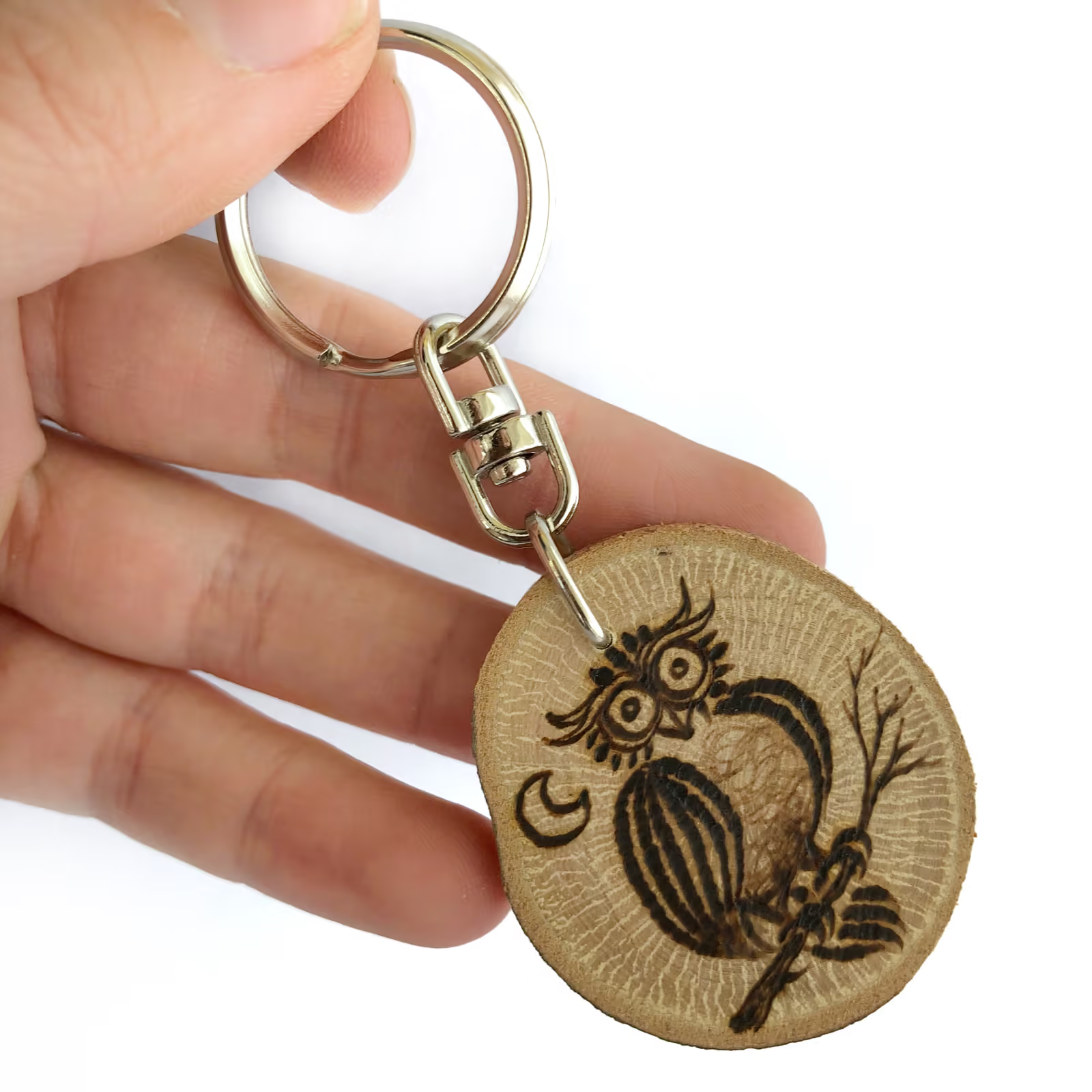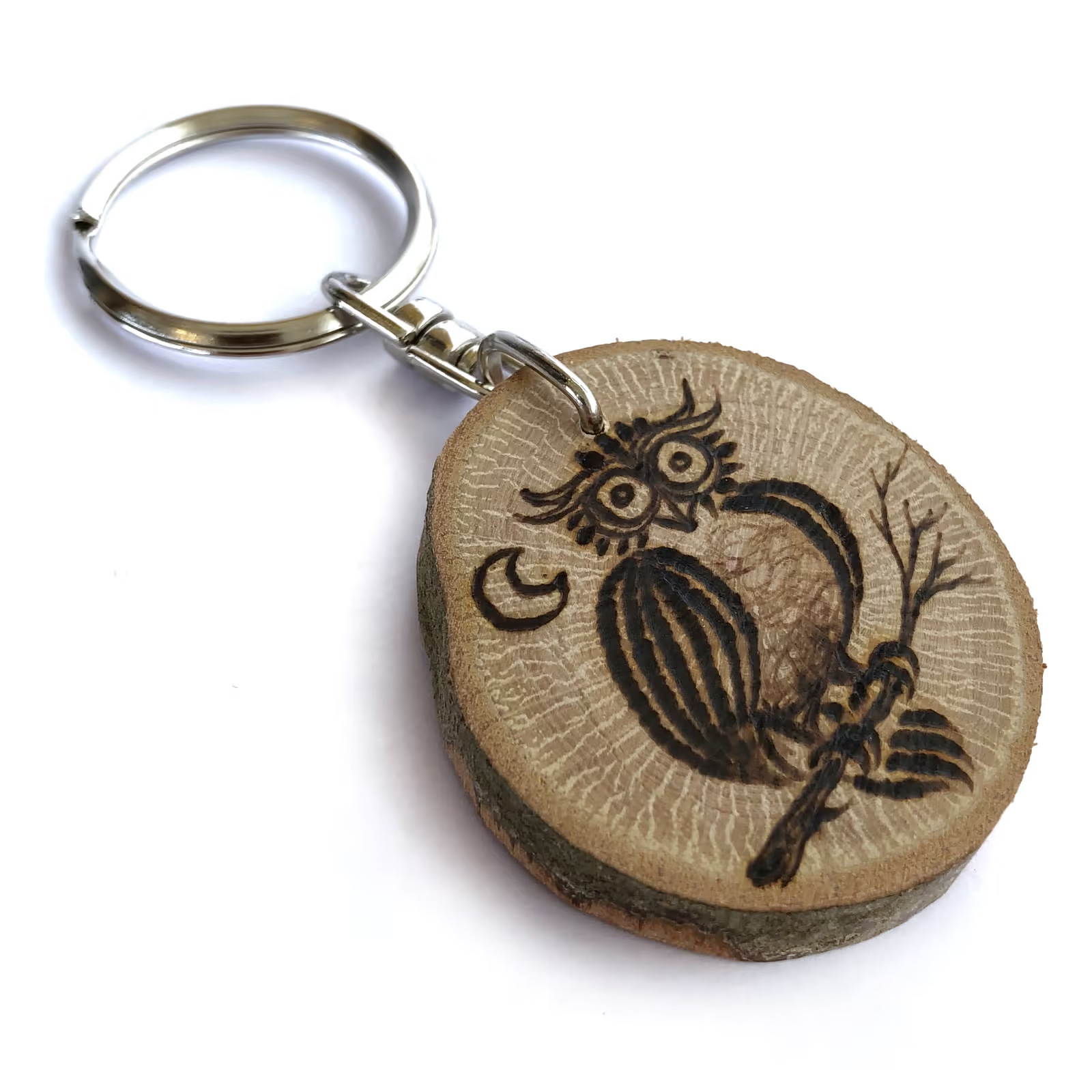 Tingues en compte que el clauer que rebis a casa pot ser lleugerament diferent de les imatges visualitzades ja que els pirogravem a mà un a un, amb la qual cosa cada clauer és únic. També la forma i mida de la rodanxa poden variar, perquè a la naturalesa no hi ha 2 branques iguals.